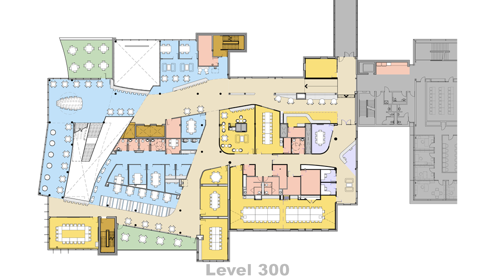 Level 200 will include a large multi-function events space that can be divided into three smaller spaces, welcome desk and atrium space with lots of seating and places for students to plug in their devices, recreation space, and Isaac's restaurant, bar, and patio.